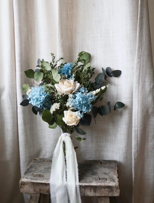 Welcome to Node & Stem, meet Adelaide. Why not make a statement on your special day with this Vintage burgundy, peach, and white bridal bouquet, thoughtfully designed with a blend of preserved hydrangeas, lifelike artificial roses, eucalyptus.. Perfect for brides who love a touch of Vintage with a romantic Autumn colour palette.