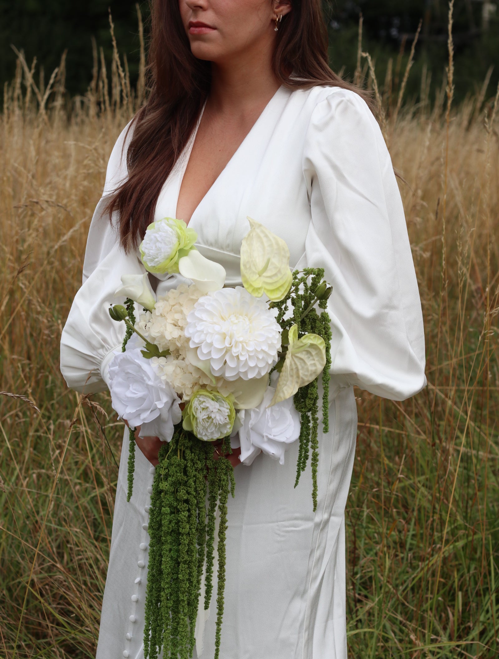 Featuring realistic artificial roses, dahlias, calla lilies, ranunculus, peace lilies, and preserved ivory hydrangea, this bouquet is finished with a touch of green preserved amaranth cascading down, adding movement and texture. Perfect for brides who love a dramatic yet classic floral design.